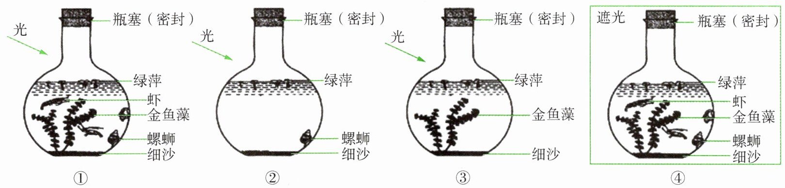 28. 在跨学科实践“设计并制作能较长时间维持平衡的生态瓶”活动过程中,某兴趣小组为探究“消费者对生态系统稳定性的影响”,设计了如下四个生态瓶,其中可作为对照实验的是()