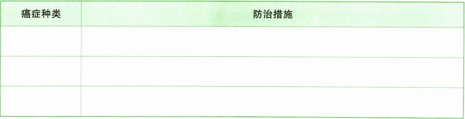 现有研究表明,癌症防治能显著降低癌症的发病率和死亡率,保护人们的生命安全和身体健康。请通过查阅资料或走访当地肿瘤医院等途径收集癌症防治措施的资料,填写下表,并在班级内与同学交流。