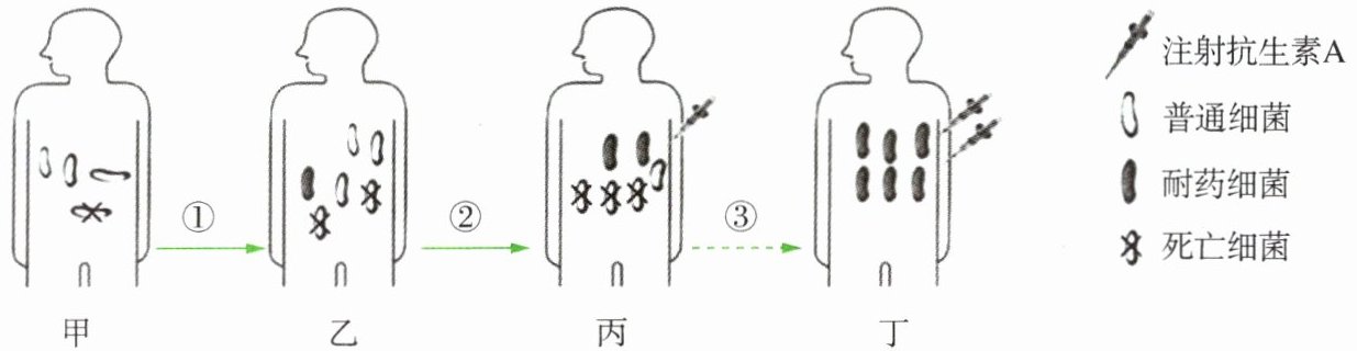 29. (5分)抗生素的利用为细菌性疾病患者带来福音,但滥用抗生素却催生“耐药细菌”。图中①②③表示细菌在人体内的变化过程,请据图回答下列问题。