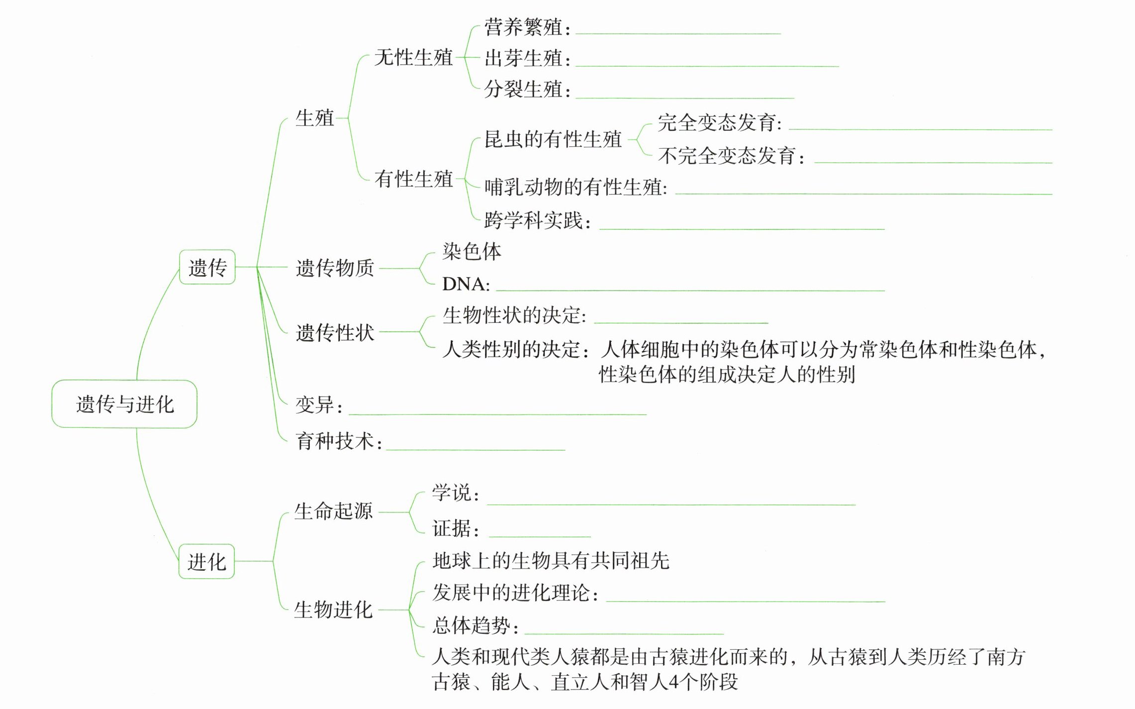 答案:(从上至下)植物通过营养器官繁殖后代的方式 像酵母菌这样通过产生芽体繁殖后代的方式 像细菌这样一分为二繁殖后代的方式 像家蚕一样,一生经过受精卵、幼虫、蛹和成虫4个时期 像蝗虫一样,一生只经过受精卵、若虫和成虫3个时期 由睾丸和卵巢分别产生的精子和卵细胞结合形成受精卵,再发育成新个体 饲养家蚕,收集我国养蚕的历史资料 主要的遗传物质,包括许多基因(含有遗传物质的DNA片段) 由基因组成和环境共同决定 普遍存在,遗传信息的改变可能引起生物变异 对农业生产有巨大推动作用 多种,化学演化学说认为生命最有可能在原始海洋中形成 化石是直接证据 生物进化是遗传变异和环境因素共同作用的结果 由简单到复杂,由水生到陆生