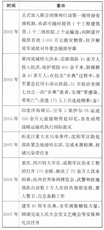 材料二 21世纪初人民军队发展大事年表(部分)。