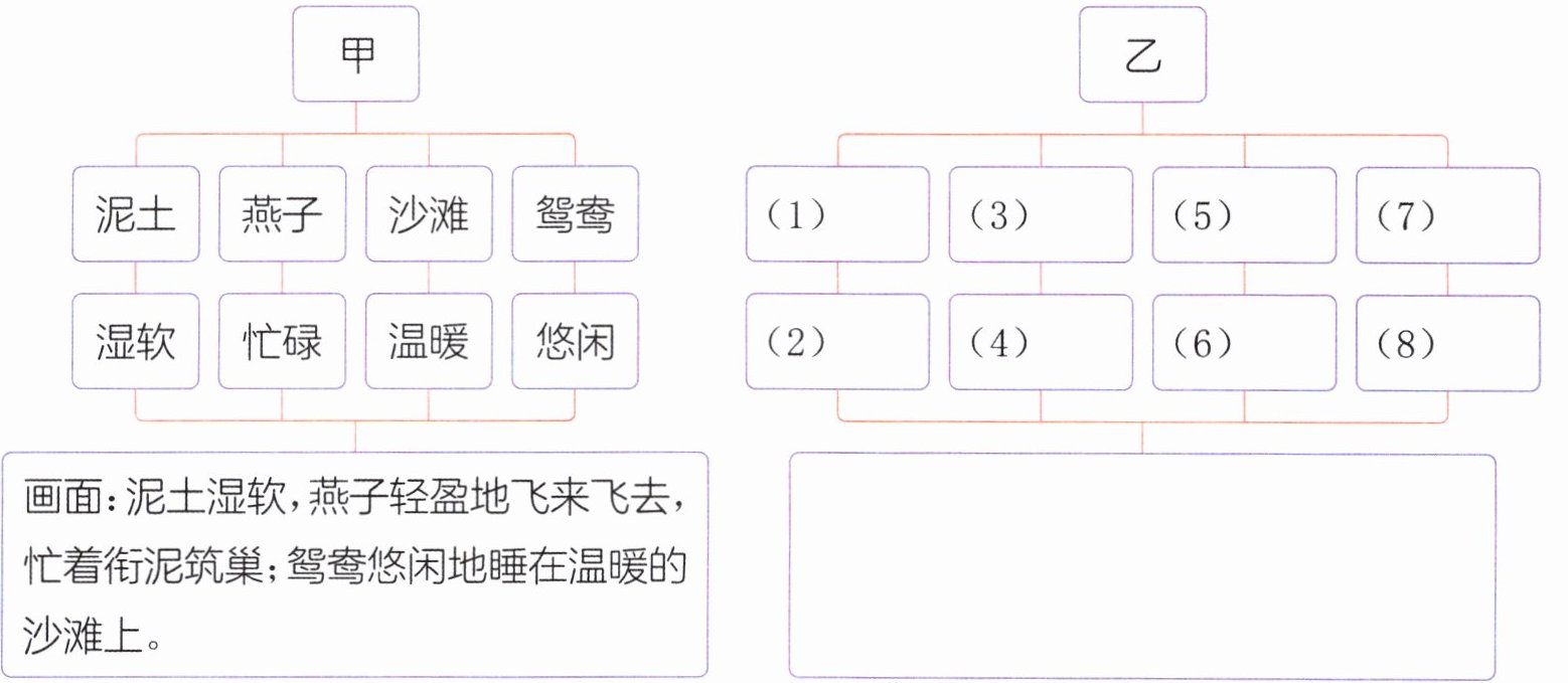 2. 乙诗描写了哪些具体景物?它们分别有怎样的特点?这些景物构成了怎样的画面?照样子填一填。