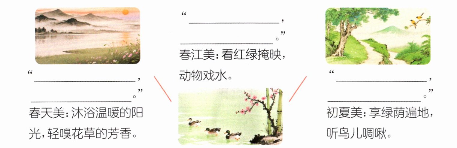 答案:四、1. 春日 2.(1)江水 (2)碧绿 (3)飞鸟 (4)洁白 (5)山峰 (6)青翠 (7)花朵 (8)鲜红 画面示例:在碧绿的江水的映衬下,水鸟的羽毛显得更加洁白;青翠的山上,一朵朵花儿火红,仿佛要燃烧起来。