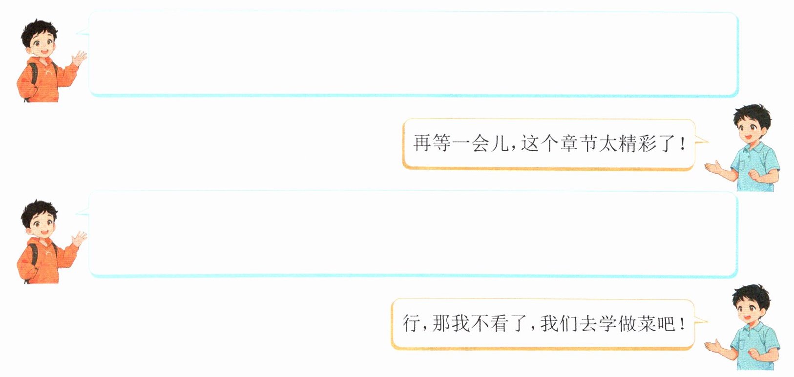 表达合理意见六、小语的表哥很喜欢看武侠小说,一看就是大半天。周末,小语去表哥家做客,看到了这一幕,他应该怎样劝告表哥呢?请根据情境完成对话。