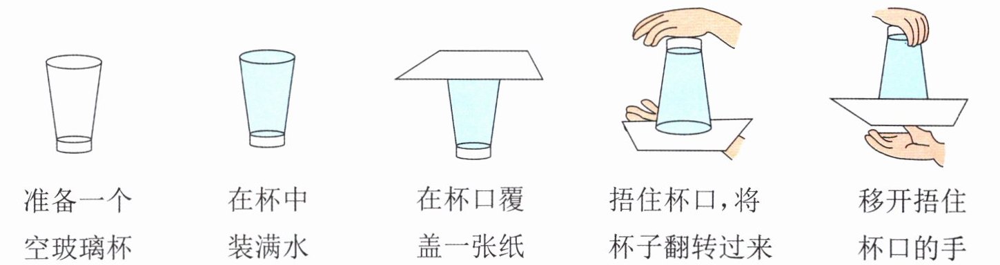示例:先准备一个空玻璃杯;接着在杯中装满水;然后在杯口覆盖一张纸,用手捂住杯口,将杯子翻转过来;最后慢慢移开捂住杯口的手,你会发现杯中的水不会洒出来。