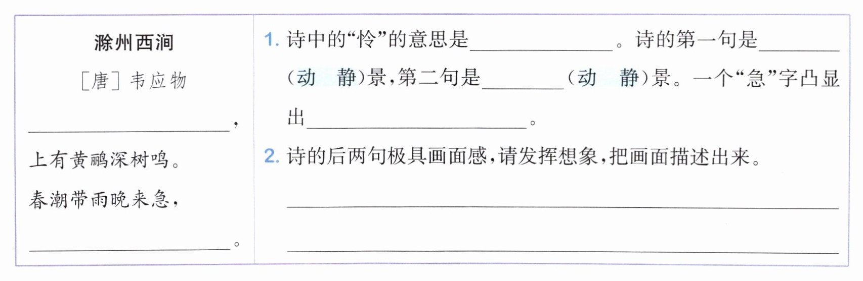 联想美好画面三、优秀的联想能力对做“有心人”来说也很重要。和诗人一起观察自然景色,先补全诗句,再完成相关练习。