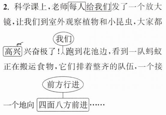 科学课上,老师每人给我们发了一个放大镜,让我们到室外观察植物和小昆虫,大家都高兴奋极了! 跑到花池边,看到一队蚂蚁正在搬运食物,它们排着整齐的队伍,一个接一个地向四面八方前进……