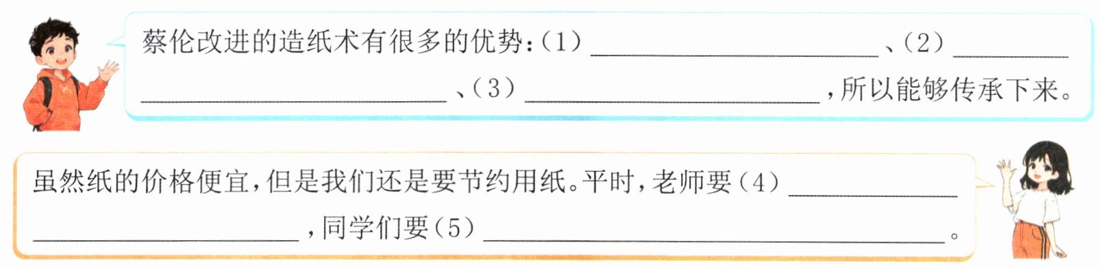4. (情境学习)读完选段,同学们就“纸”的话题展开了讨论,请你补全对话。
