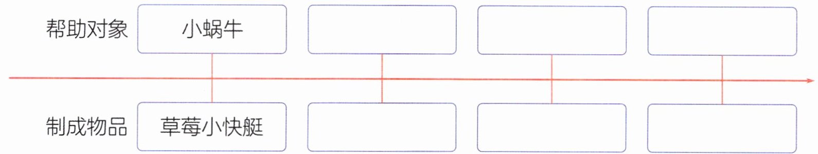 ③ “小蜗牛,请你品尝我的草莓吧!”小蜗牛把大背包使劲儿地往上抬了抬,说:“嗯!谢谢你,但是这时候不行呀!我要到河对岸的姐姐家去,正发愁怎么过河呢!”小老鼠拍了拍脑门:“我有办法。”他给小蜗牛做了一个草莓小快艇,后面的草莓把儿使劲儿一拽,是个很不错的小马达。草莓小快艇像一条长满了鳞片的小红鱼,驮着小蜗牛一下子驶到了河对岸。