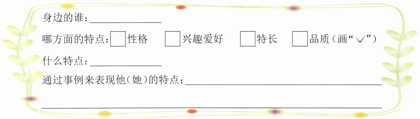 哪方面的特点:□性格 □兴趣爱好 □特长 □品质(画“√”)