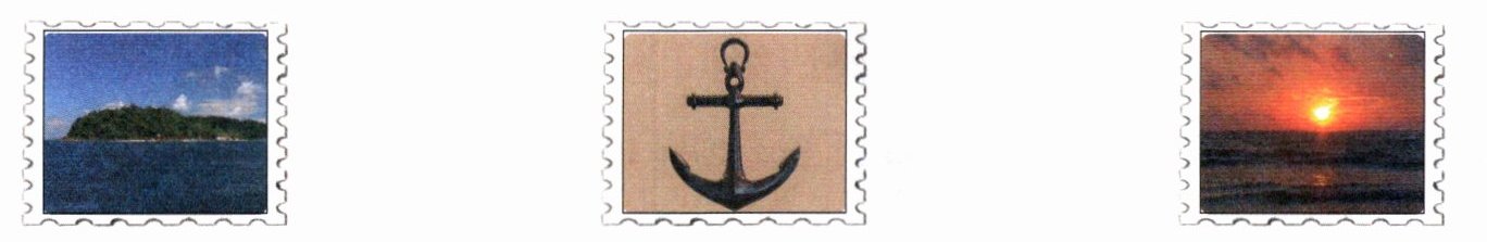 航(xún xún)1. 小语根据上面的词语设计了几张主题邮票,请你将词语填入对应的邮票下面。