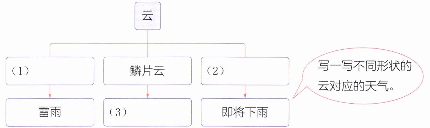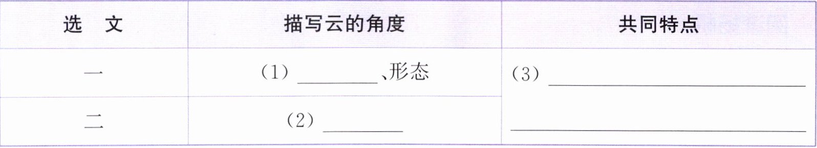 答案:1. 颜色 金灿灿 一匹马 变化极多 2. “烧”的意思是使东西着火。用“烧”字写出火烧云颜色变化的动态,准确、生动地写出了火烧云颜色的特点。 3. (1)砧状云 (2)钩卷云 (3)晴天 4. (1)颜色 (2)形态 (3)都描写了云的形态变化特点