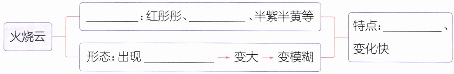 1. (阅读要素)体会选文一是怎样把火烧云的特点写清楚的,补充下面的思维导图。