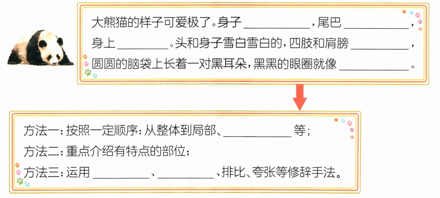 四、[片段练习]写一写,掌握介绍大熊猫外形的方法并完成练习。