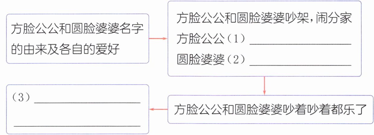 ③ 方脸公公喜欢方方的东西,他喜欢坐方方的凳子,喜欢用方方的收音机听新闻,就连走路也喜欢迈四方步子。圆脸婆婆喜欢圆圆的东西,她吃饭要用圆圆的饭碗,梳头要照圆圆的镜子,就连睡觉也要枕一个圆圆的大南瓜枕头。