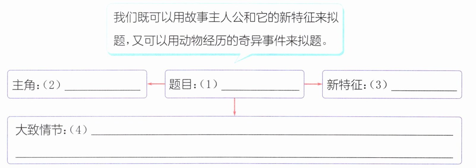 我们既可以用故事主人公和它的新特征来拟题,又可以用动物经历的奇异事件来拟题。