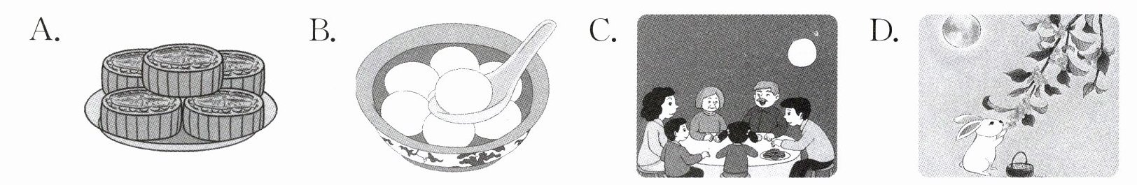 )答案:2. B 解析:A、C、D 三项描绘的分别为月饼、一家人赏月、桂花,都与中秋节有关,而 B 项描绘的汤圆与元宵节有关。