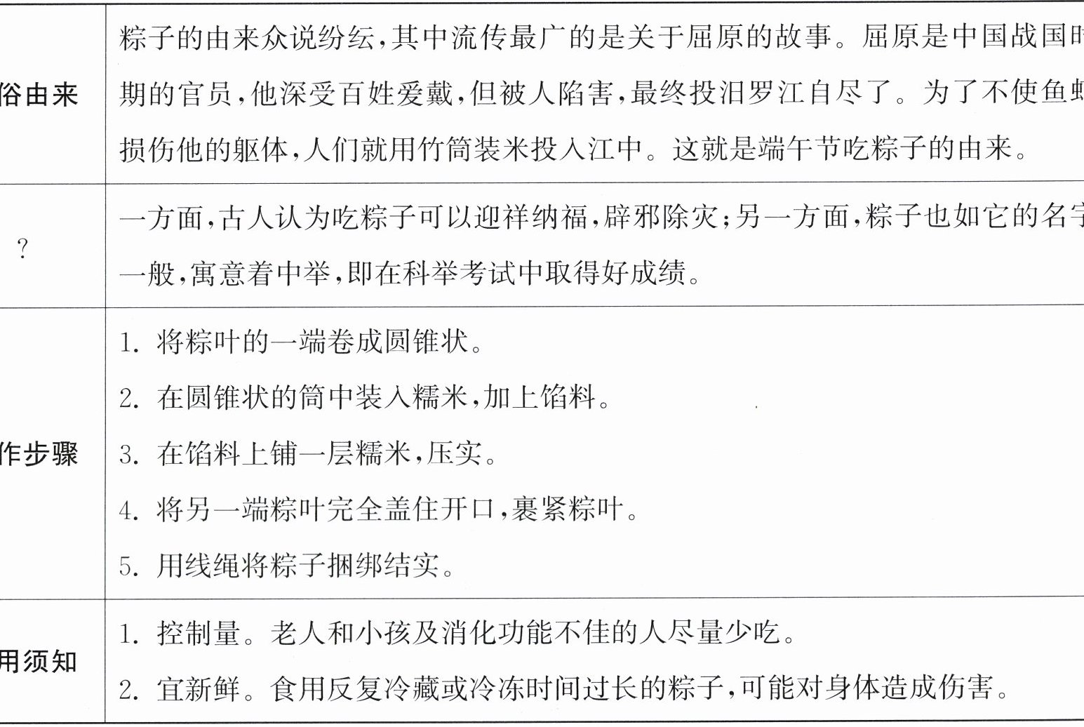 答案:1. 装米、加馅 铺米、压实 捆绑 2. B 解析:结合材料一中“一方面,古人认为吃粽子可以迎祥纳福,辟邪除灾;另一方面,粽子也如它的名字一般,寓意着中举,即在科举考试中取得好成绩”可知,这段话主要讲述了人们赋予吃粽子这一习俗的寓意,包括迎祥纳福、驱邪避灾以及取得好成绩。3. (1)× (2)× (3)√ 解析:结合材料二中“端午节还有许多习俗,如人们赛龙舟、佩戴香包、涂抹雄黄等,这些习俗随着时间和地区的不同有所变化”可知,端午节的习俗有赛龙舟、佩戴香包、涂抹雄黄等,而“喝屠苏酒”是春节的习俗。故第(1)题说法错误。结合材料一中的食用须知“老人和小孩及消化功能不佳的人尽量少吃”可知,小朋友应尽量少吃粽子。故第(2)题说法错误。4. 示例:我觉得她的做法不正确。 因为吃粽子要吃新鲜的,食用反复冷藏或冷冻时间过长的粽子,可能会对身体造成伤害。