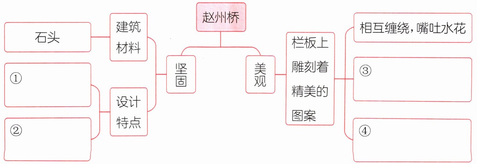 答案:五、① 只有一个拱形大桥洞 ② 大桥洞顶上的左右两边各有两个拱形的小桥洞 ③ 相互抵着,回首遥望 ④ 双龙戏珠