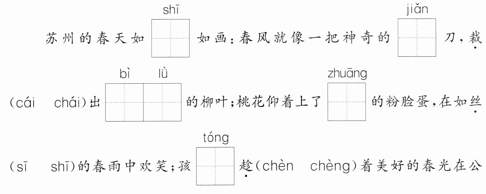 种意思。答案:1. cái sī chèn 2. 诗 剪 碧绿 妆 童 3. ③