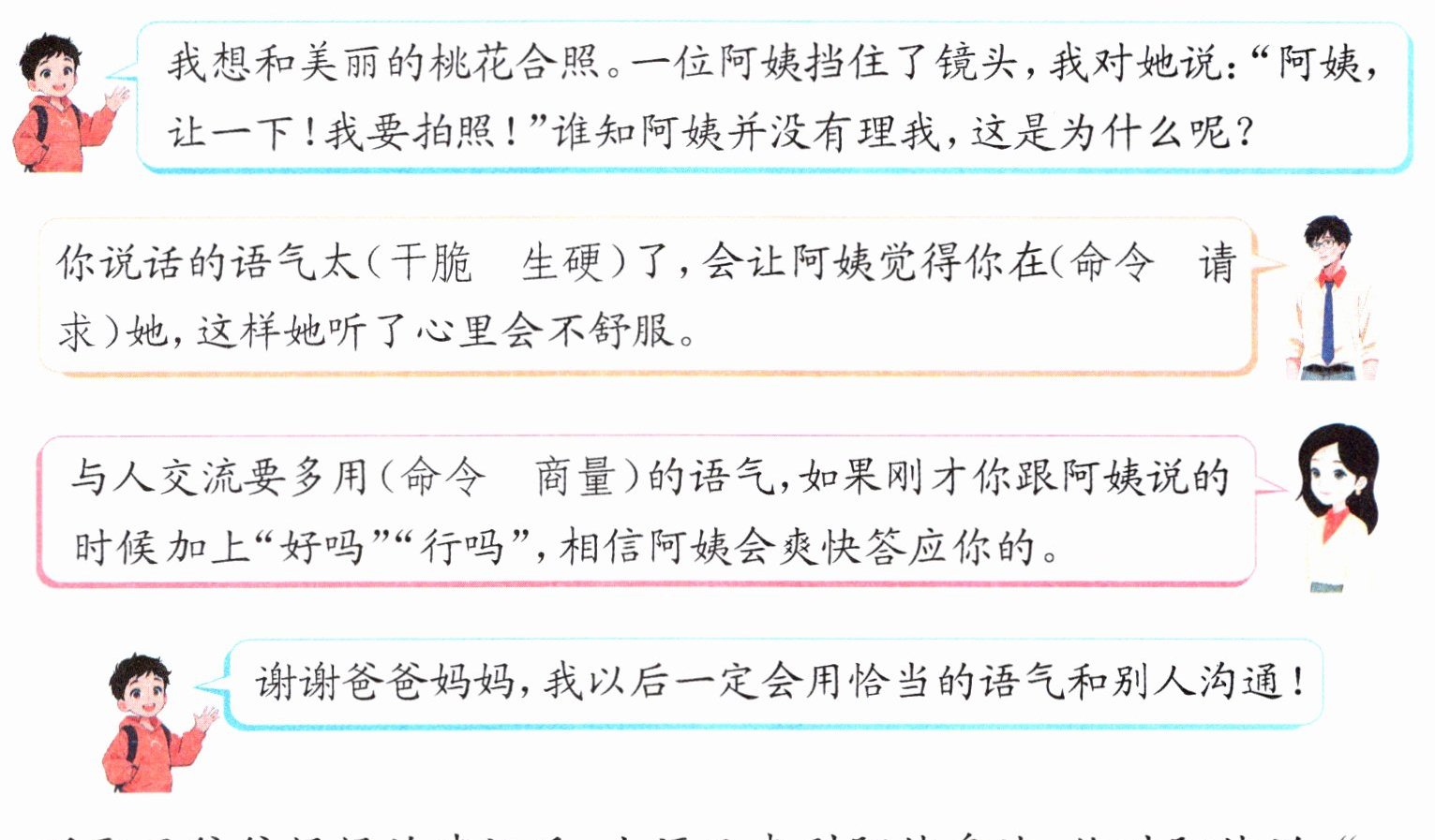 答案:你说话的语气太(干脆 生硬√)了,会让阿姨觉得你在(命令√ 请求)她,这样她听了心里会不舒服。