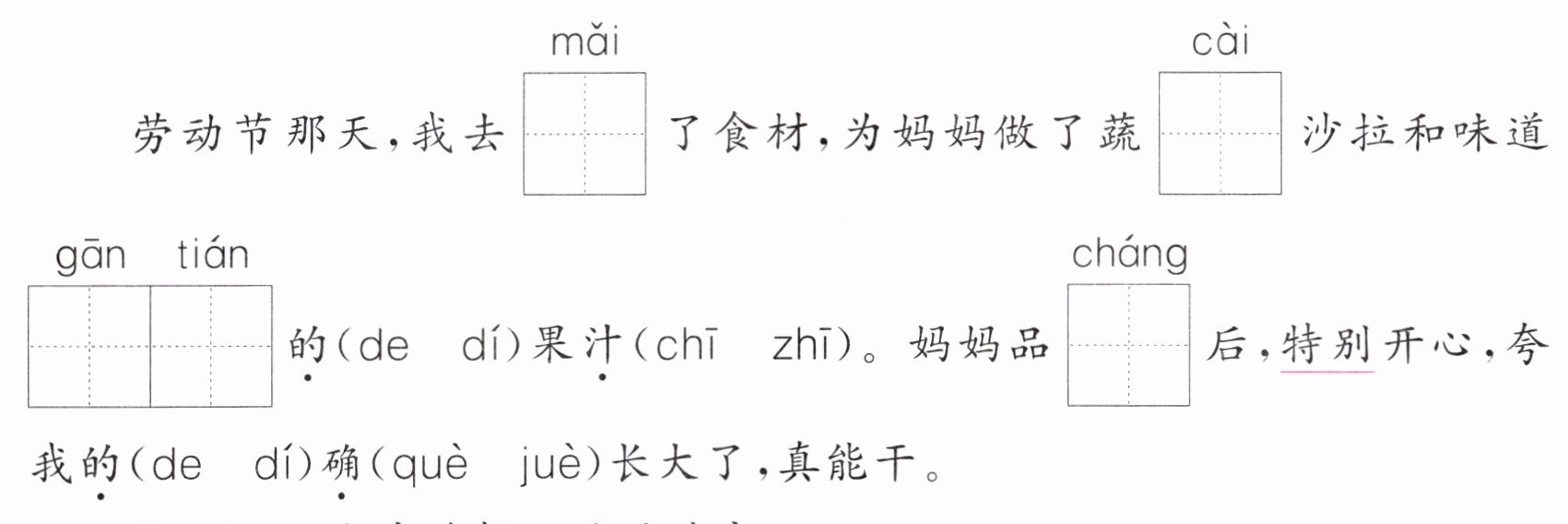 答案:1. de zhī dí què 2. 买菜 甘甜 尝 3. ① 解析:“特别开心”里的“特别”强调“开心”的程度深,即“格外”开心;选项②,侧重和别人不一样;选项③,侧重专为某事。选项②和选项③都不符合语境。