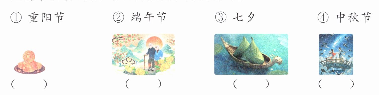节日习俗我了解 二、我知道很多传统节日。先根据图片中的活动,选出对应的节日名(填序号),再按要求完成练习。