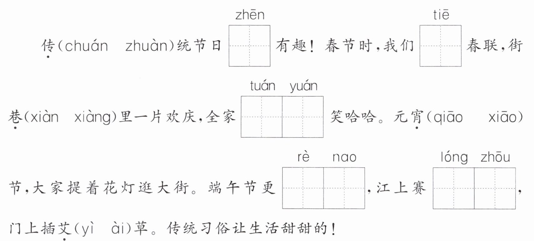 答案:一、chuán 真 贴 xiàng 团圆 xiāo 热闹 龙舟 ài