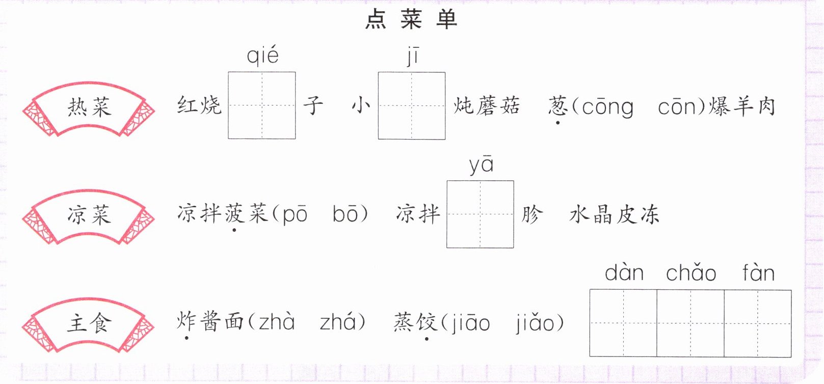 1.热菜:茄 鸡 cōng 凉菜:bō 鸭 主食:zhá jiǎo 蛋炒饭