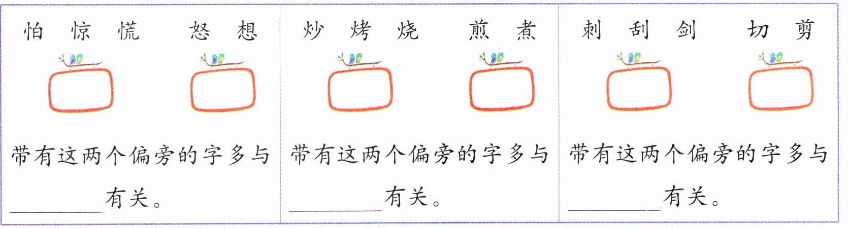 答案:第一列:忄 心 心理、情感 第二列:火、灬 火 第三列:刂 刀 刀或切割
