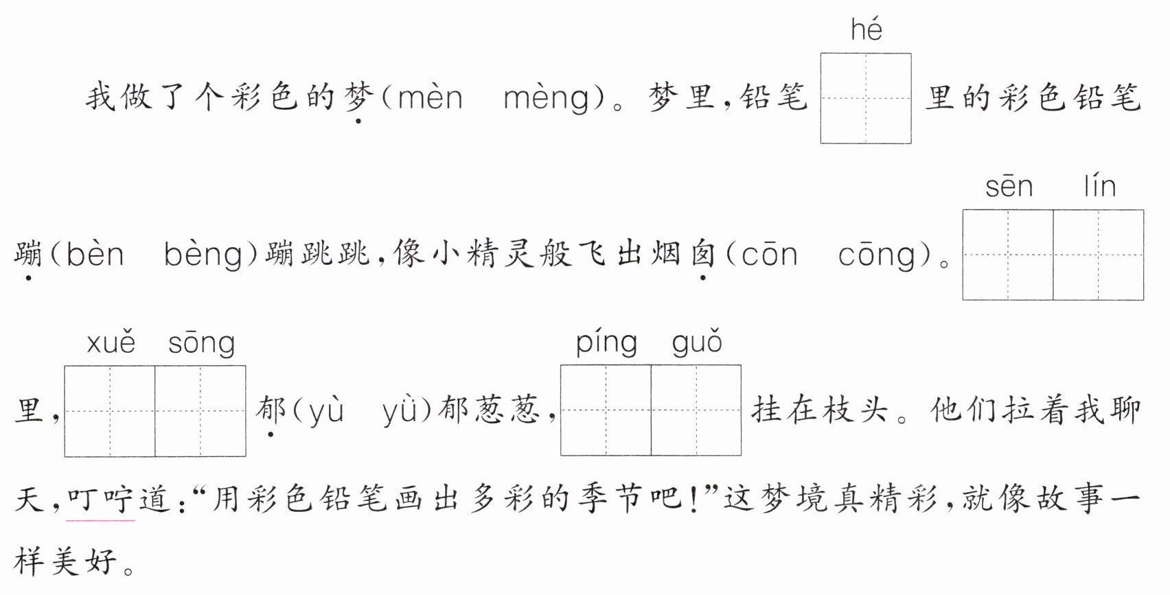 答案:1. mèng 盒 bèng cōng 森林 雪松 yù 苹果
