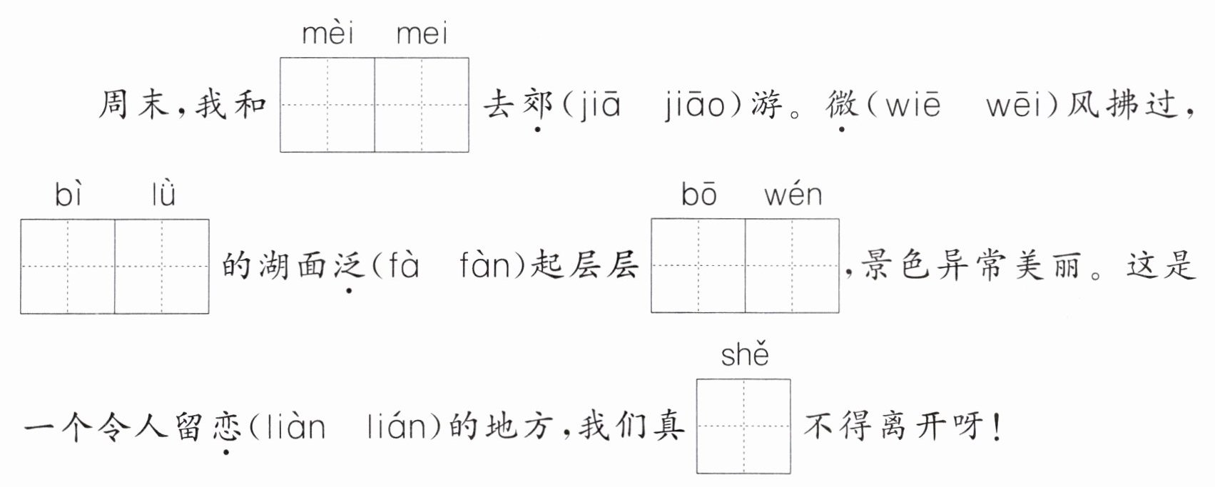 )。(填序号)答案:1. 妹妹 jiāo wēi 碧绿 fàn 波纹 liàn 舍