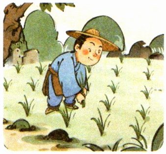 古时候有个人,他巴望自己田里的禾苗长得快些,天天到田边去看。可是,一天,两天,三天,禾苗好像一点儿也没有长高。他在田边焦急地转来转去,自言自语地说:“我得想个办法帮它们长。”