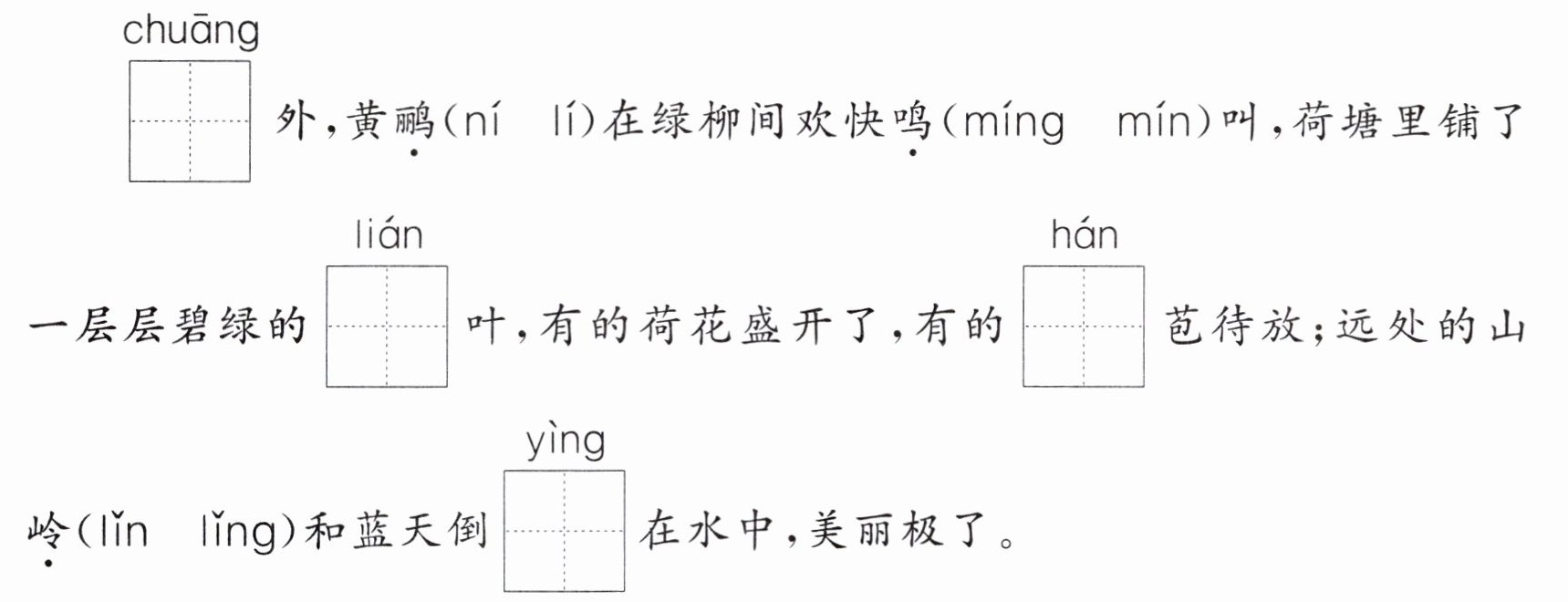 答案:1. lí míng lǐng 2. 窗 莲 含 映