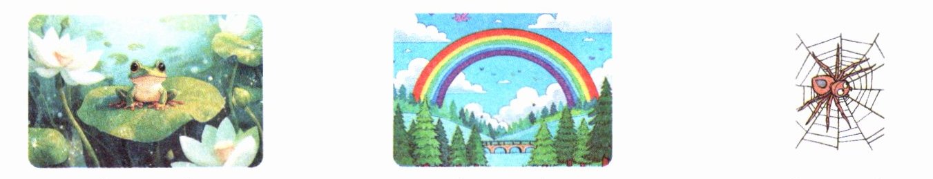 雨停了。太阳出来了。① 一条彩虹挂在天空。② 蝉叫了。③ 蜘蛛又坐在网上。④ 池塘里水满了,青蛙也叫起来了。