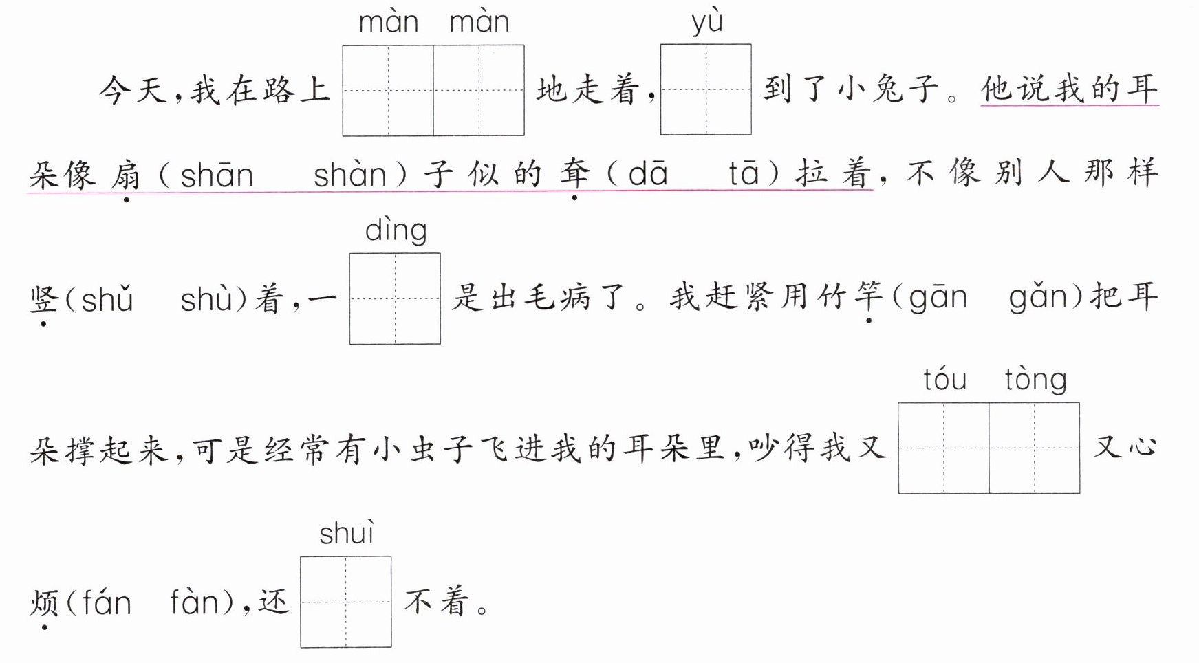 。答案:1. shàn dā shù gān fán 2. 慢慢 遇 定 头痛 睡 3. 示例:月亮 玉盘 挂在空中