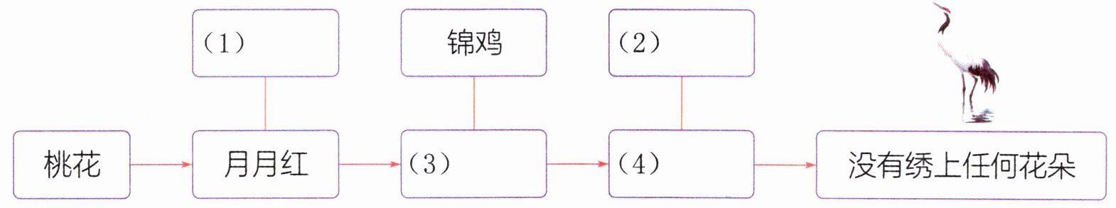 鹤觉得锦鸡说得对,便又把月月红拆了,开始绣牡丹。绣了一半,画眉在鹤头上惊叫道:“鹤大嫂,你爱在水塘里栖息,应该绣荷花才是。为什么要绣牡丹呢?”