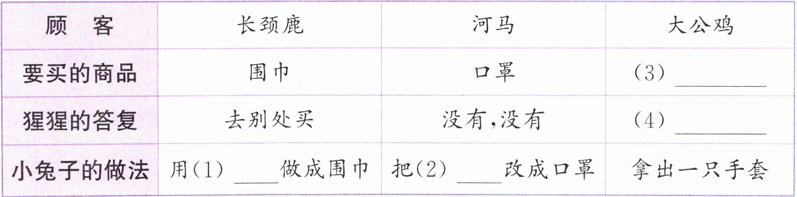 2. (语文要素)根据短文内容,把下面的表格补充完整(填序号),再借助表格讲一讲这个故事。