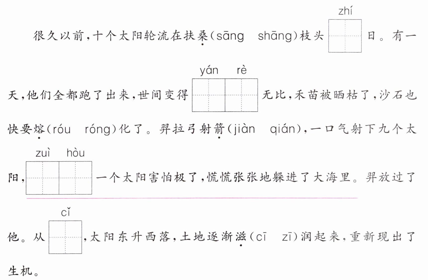 二、羿是怎样射日的? 选择合适的动词填空。(填序号)