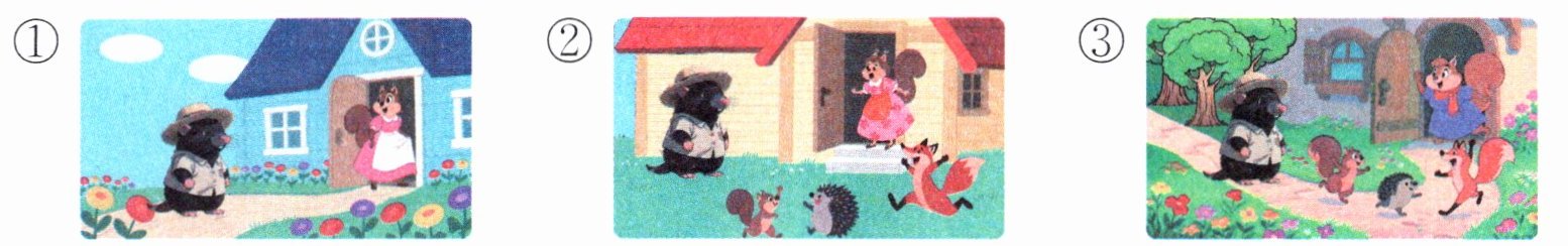 答案:1. ③ 解析:第①自然段描述了鼹鼠先生来到松鼠太太门前,松鼠太太出门看到门前的小路上花朵簇簇,小松鼠、小刺猬和小狐狸在快活地蹦跳。因此,选择的图片应该包含以上元素。