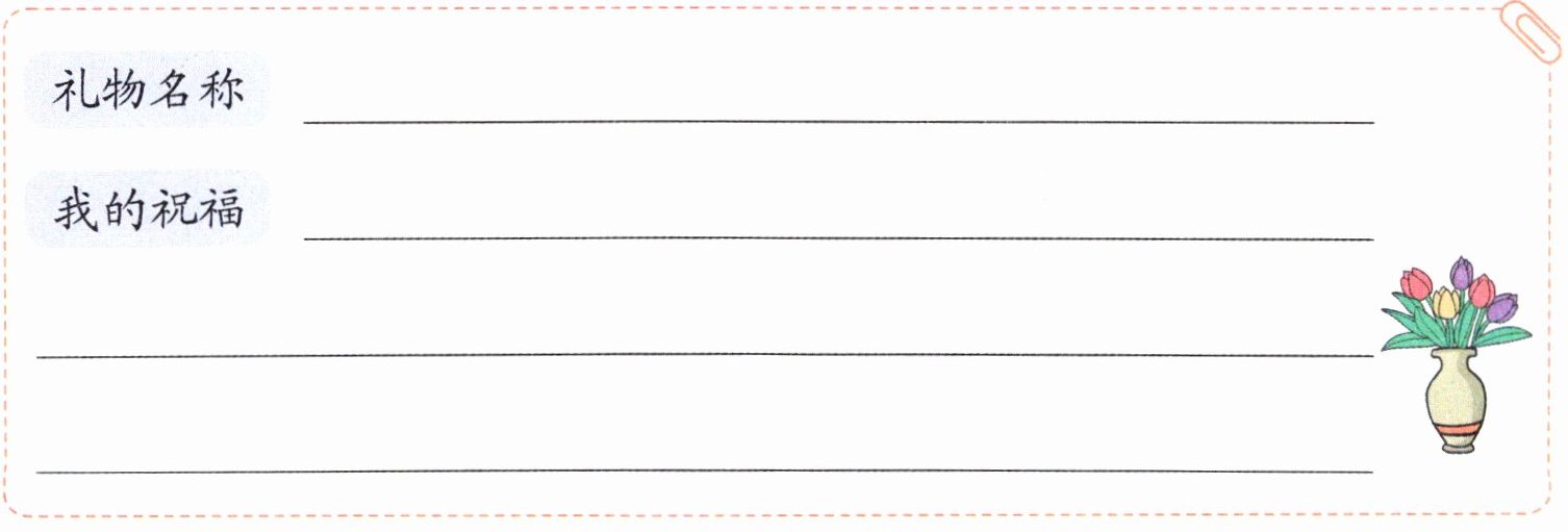 五、生活中也有很多“美好的礼物”。今年的母亲节,你想送给妈妈什么礼物呢?请你给妈妈送一份“美好的礼物”,表达你的祝福吧!