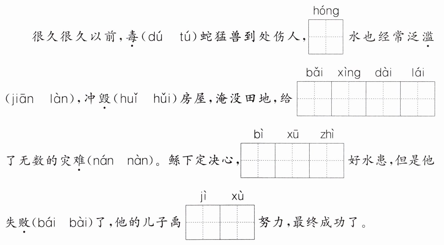 种解释。答案:1. dú làn huǐ nàn bài 2. 洪 百姓带来 必须治 继续 3. 力 5 ①