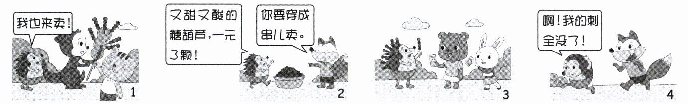 答案:示例:集市上,小袋鼠在卖糖葫芦,大家都争着去买。小刺猬看到了,十分羡慕,心想:“我也来卖!”小刺猬买了一堆山楂也到集市上卖,他吆喝着:“又甜又酸的糖葫芦,一元3颗!”可是没有人来买。这时,狐狸来了,他假惺惺地对小刺猬说:“你要穿成串儿卖。你身上这么多的刺,正好拔下来穿糖葫芦。”小刺猬听了他的话,拔下身上的刺穿糖葫芦,果然卖出去很多,但最后他身上的刺都被拔完了。回家路上,他又遇到了狐狸,狐狸舔着舌头恶狠狠地朝小刺猬扑过来。小刺猬哭着说:“啊!我的刺全没了!这下糟糕了!”