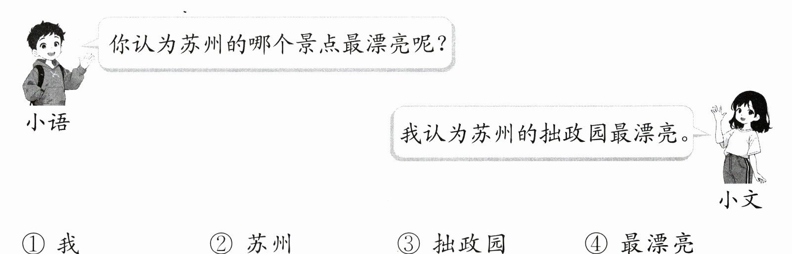 2. ③ 解析:抓住问句中的“哪个景点”来回答,即可得知应该重读“拙政园”。