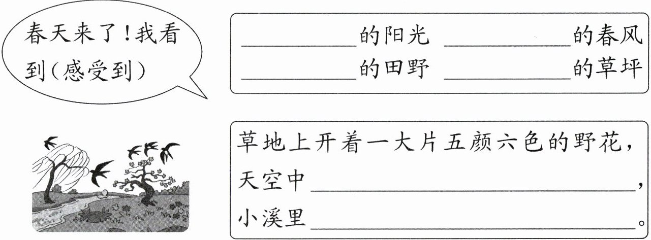 答案:四、示例:温暖 轻柔 碧绿 松软 飞着一只只轻巧可爱的燕子 游着一大群自由自在的鱼儿