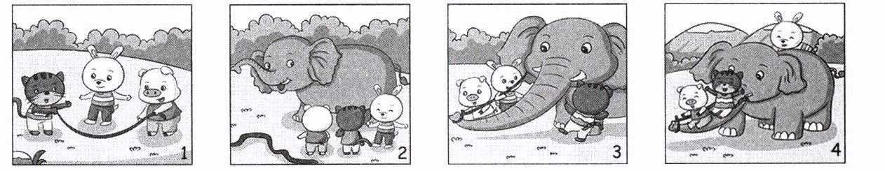 答案:示例:小猫、小兔和小猪在山坡上跳绳,玩得很开心。大象也想和他们一起玩。可是,大象太大了,不能和他们一起跳绳。这可怎么办呢?大家一起想了一个好办法,小猪和小兔把绳子的一头系在大象的鼻子上,另一头系在大象的耳朵上,把绳子当扶手用。然后大家爬到了大象的身上,依次从大象的鼻子上滑下来。“哈哈哈……”他们玩得可开心了。