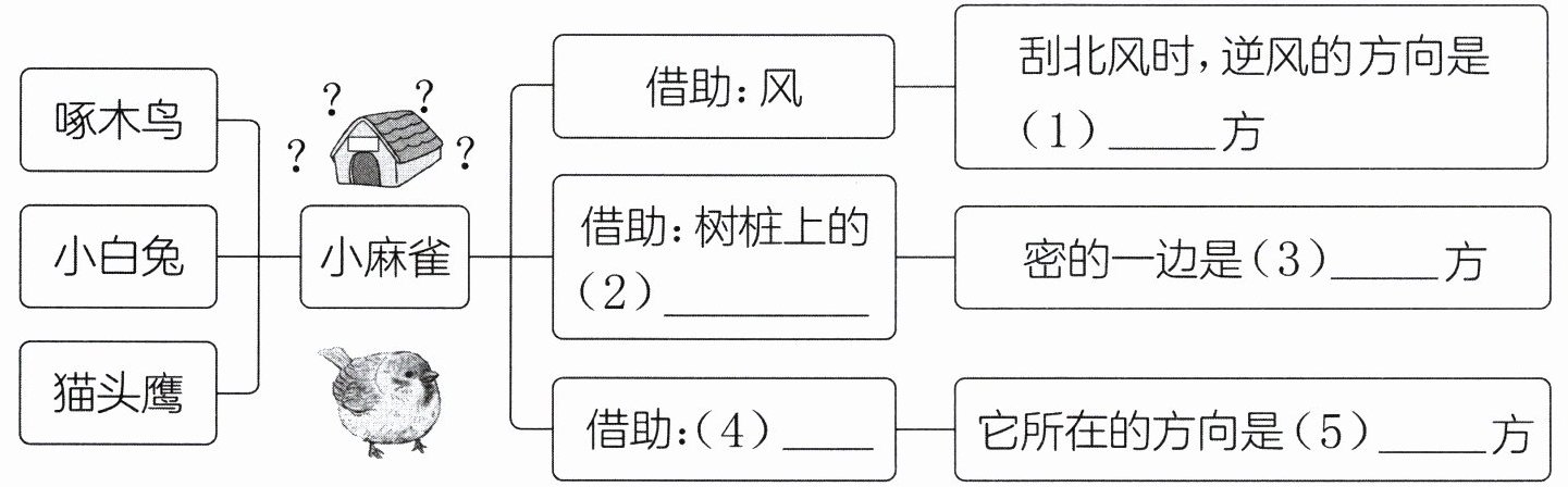 1. (语文要素)小动物们是怎样教小麻雀辨别方向的?把下面的思维导图补充完整。(填序号)(10 分)
