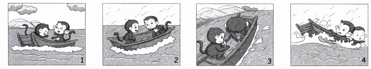 答案:示例:一天,两只小猴子坐船去外婆家。不一会儿,突然下起了大雨,哗啦啦,如瓢泼一般,雨水落进了船里。其中一只小猴子说:“我们要把水排出去。”于是,他们在船底打了一个洞,想让雨水流出去。最后,雨水没有流出去,河里的水反而漫进了船里。船里的水越来越多,逐渐吞没了小船,两只小猴子掉进了水里。
