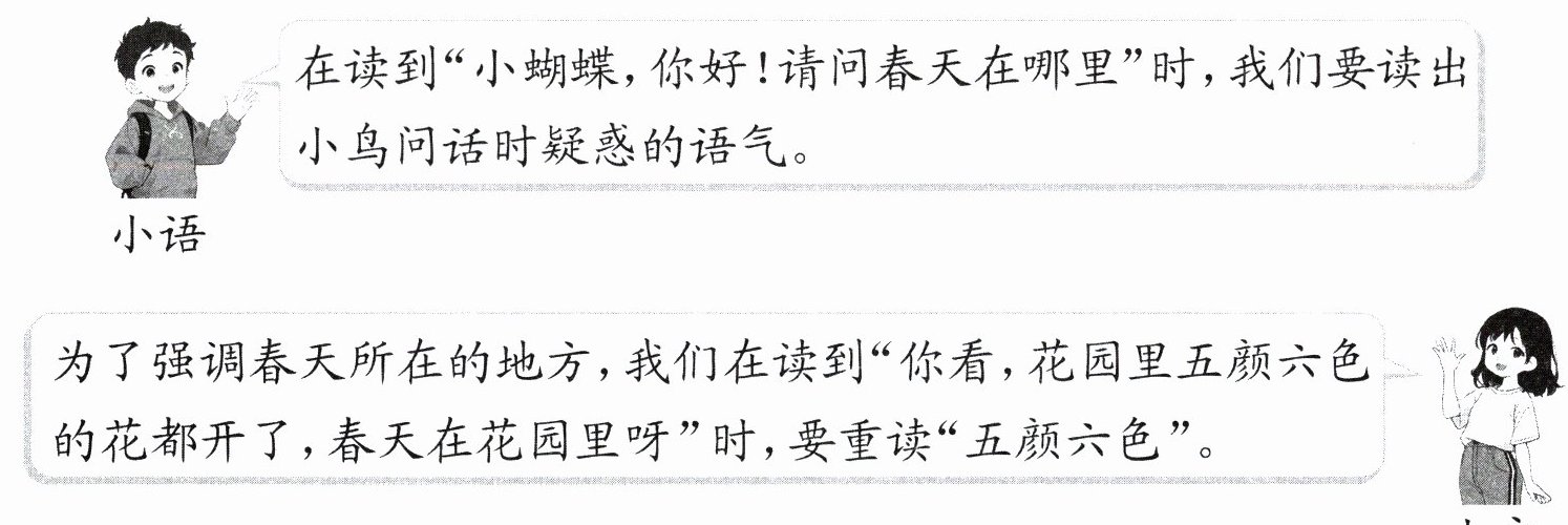 ② 小鸟在树林里一边唱着“春天在哪里呀,春天在哪里”的歌,一边快乐地飞着。它看见草地上有一只小白兔,于是它赶忙飞过去,有礼貌地问道:“小白兔,你好!请问春天在哪里?”小白兔用手指着绿绿的小草,笑眯眯地说:“你看,小草长出来了,春天就在这里。”“谢谢你!”