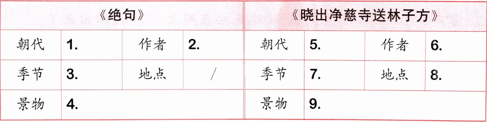 ① 宋 ② 杨万里 ③ 杜甫 ④ 唐 ⑤ 夏季 ⑥ 春季 ⑦ 莲叶、荷花 ⑧ 黄鹂、翠柳、白鹭、青天、千秋雪、万里船 ⑨ 西湖